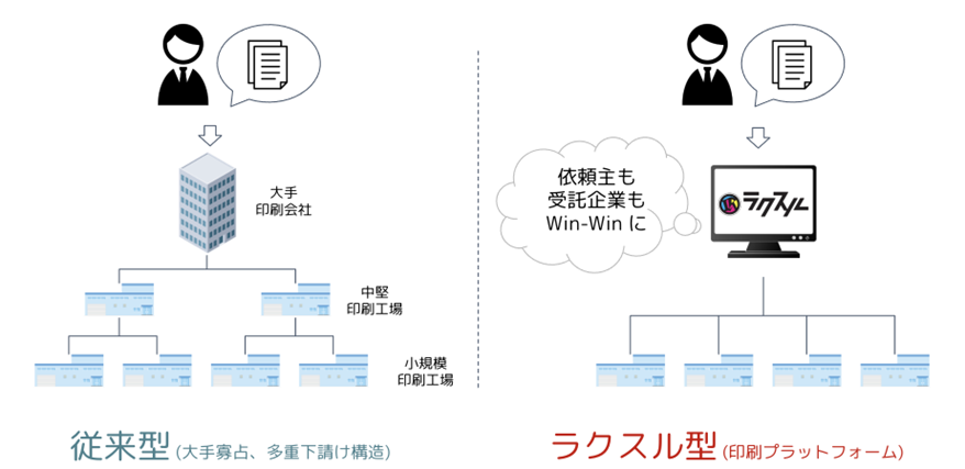 ラクスルは印刷を依頼する人とそれを請け負う印刷工場を直接結ぶ仕組みを提供した。従来の多重下請け構造では印刷価格は高く、小規模印刷工場の利益幅は小さかった。印刷工場の空き状況を可視化・共有し、直接印刷の依頼ができることで、依頼主も、受託企業もWin-Winになる。プラットフォームモデルは、今では当たり前かもしれないが、当時、斜陽産業であった印刷業界で実現したのはなかなかのチャレンジだったろう。